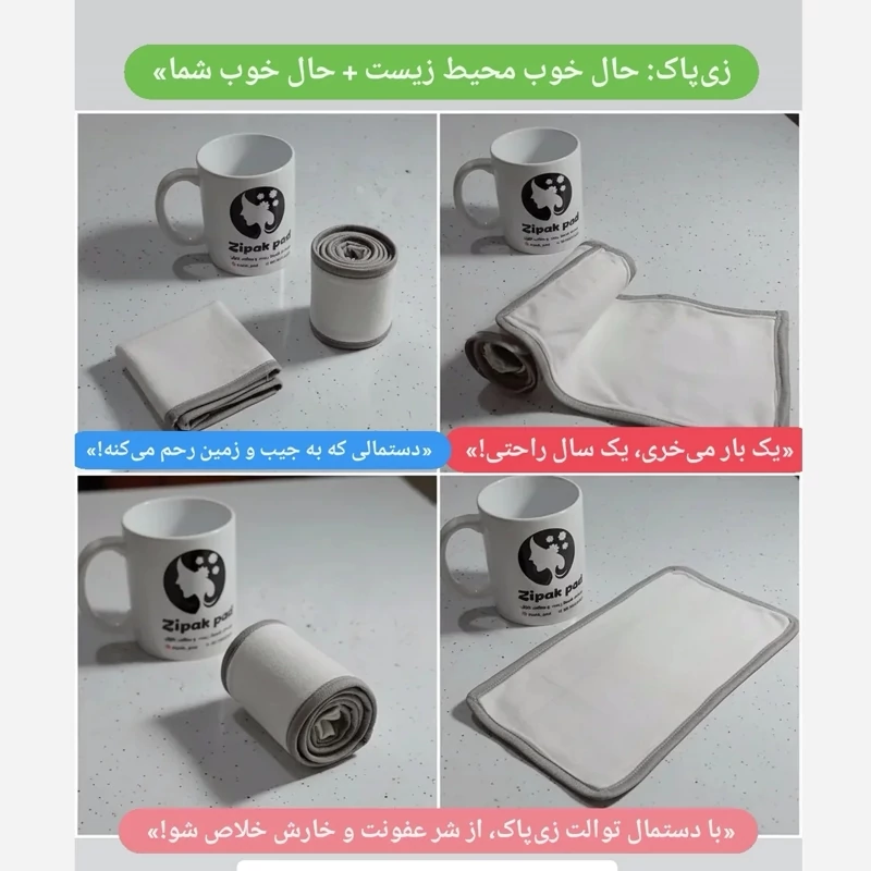 دستمال توالت رولی پارچهای زیپاک – خداحافظ جنگلبُری و پوستخشک! 📜 با هر بار رفتن سرویس لازم نیست یک تکه از جنگل رو مصرف کنید. زیپاک با دستمال توالت پارچهای و چندبار مصرف، راحتی رو برمیگردونه و زمین رو نفسکش نگه میداره. 💡 چرا بهتره؟ جنس نرم و ضدحساسیت – خداحافظ خشکی، خارش و پرزهای آزاردهنده قابل شستوشو و چندبار مصرف – بدون تولید زباله برای پوست حساس، سالمندان و دوستداران محیطزیست عالیه با دکمه محکم بهم متصل شده و طراحی هوشمندانهاش باعث میشه مثل رول بپیچه میشه راحت داخل جا دستمال توالت قرارش داد و مثل دستمال کاغذی ازش استفاده کرد وقتی میشه هم راحت بود، هم دوستی با طبیعت رو حفظ کرد… کاغذ رو بذار برای نامه عاشقانه، نه کارای روزمره سرویس! 💰 قیمتها: هر دستمال: 25,000 تومان رول چهارعددی: 125,000 تومان 📏 قابل تنظیم در طول و عرض – ظاهری تمیز و مرتب در جا رول.
